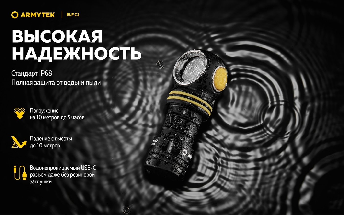 фонарь устойчив к ударам и падениям с высоты до 10 метров, а также имеет степень защиты IP68, что позволяет погружать его на глубину до 10 метров.
